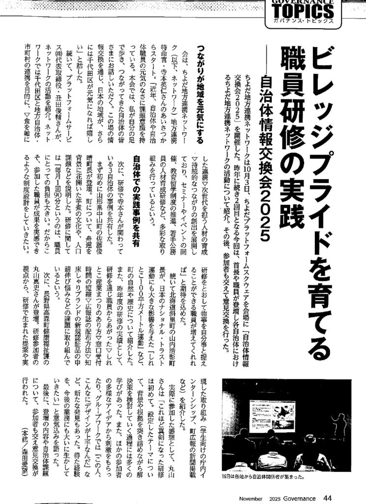 10月に開催した自治体情報交換会2025が、ガバナンスのトピックスで紹介されました。