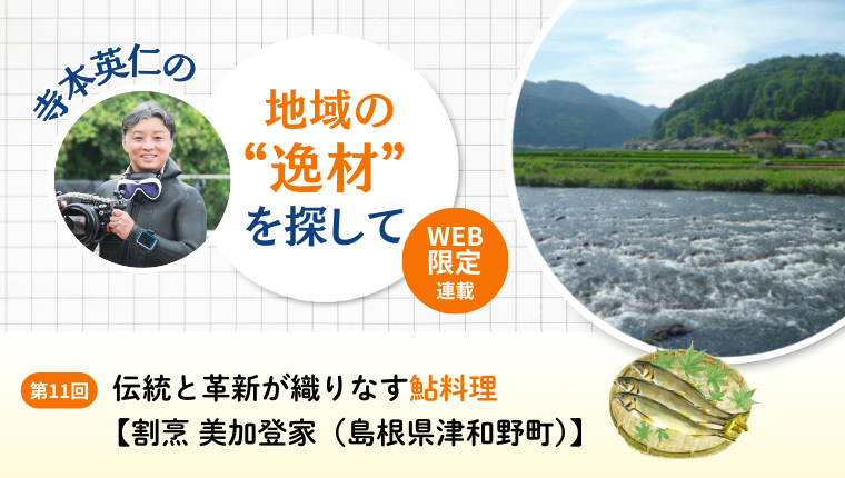 海と食を旅する地方創生プロデューサー・寺本英仁が毎月、地域の“逸材”を発掘。山根一朗さんが店主を務める島根県津和野町の『割烹 美加登家』では、高津川の天然鮎のフルコース料理がいただける。